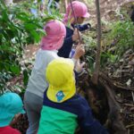 森のようちえん、サマースクールで川に向かう途中の公園で、セミの死骸に群がるアリを見つけました。