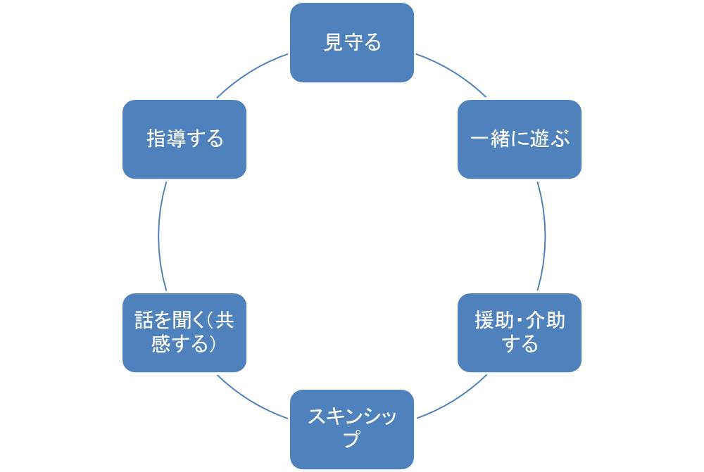 子どもとの関わり方は、その時の子どもの心理状態やその場の状況で、上記の関りの中から選択して行動しています。