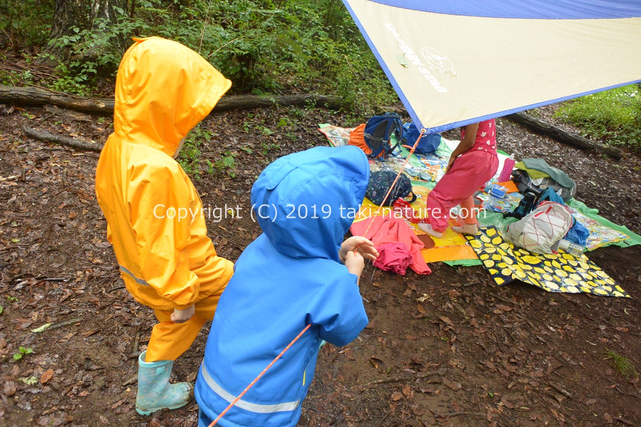 雨がたまったらたまったで、フードに落ちる雨を子どもたちがケラケラと笑います。