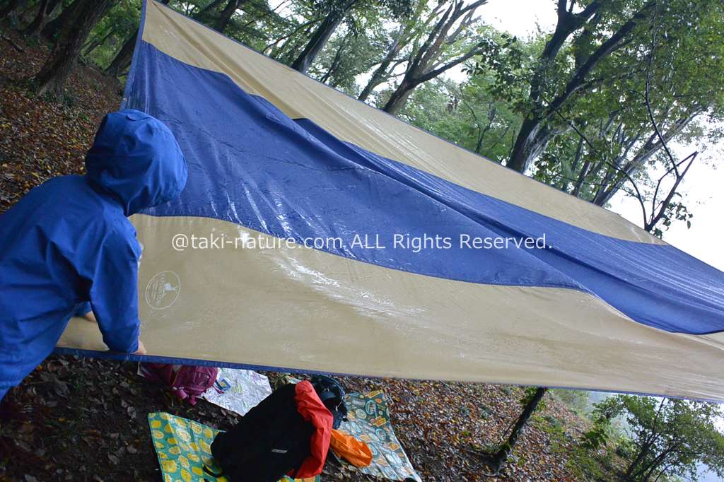 子どもたちと一緒に雨の日を体験し、タープの貼り方、ロープの結び方を学びましょう。