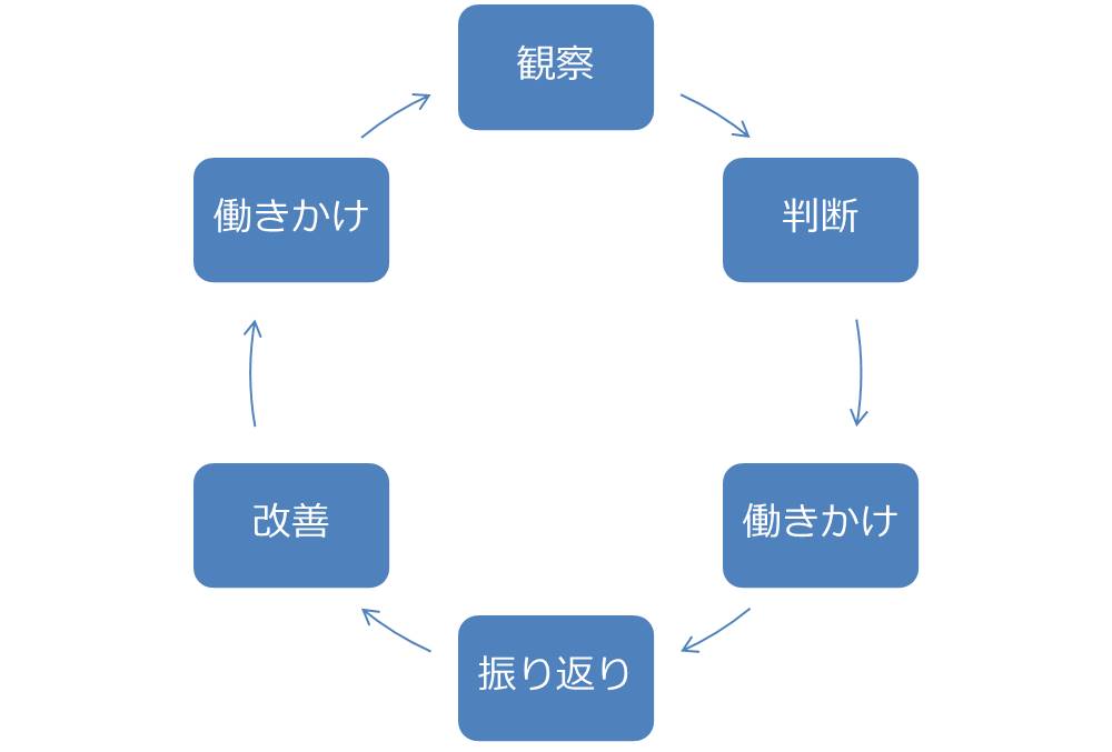 観察し、判断し、働きかけていくのですが、都度子どもの反応を観察し、働きかけを振り返り、改善策を考え、新たな働きかけを探り、また働きかけていくサイクルを繰り返していくのです。