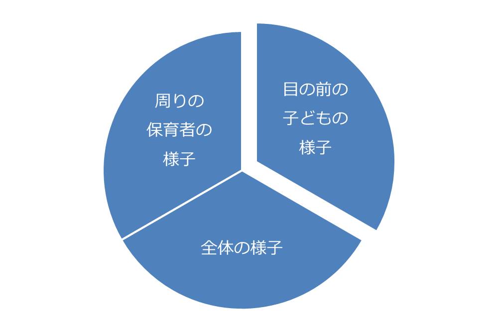 子どもが夢中になって遊んでいるのを見守っている時は目の前の子ども3割、周りの保育者の様子5割、といった具合に、状況によって観察の比率を変えるのです。