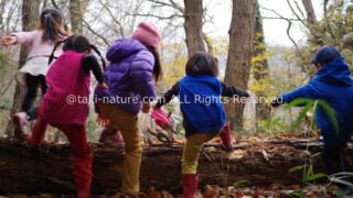 雨予報でも、こんなおおきなおうちがあるから大丈夫!お弁当の後には絵本の読み聞かせ。終わったら、森のゆうえんち、いこーよ自然の素材くらい、自由に使っていい。秘密の道、見つけた!「こっちはボルダリングね」「ひみつのおうちね」「今日はカレーだから...