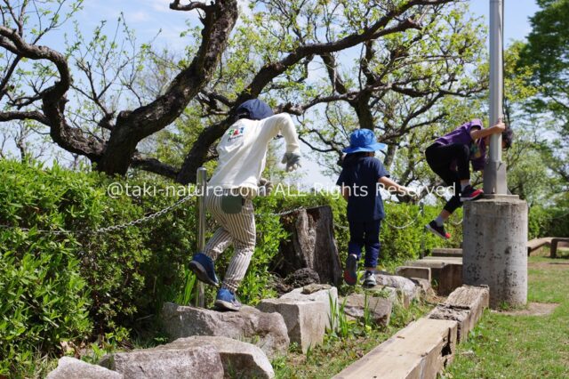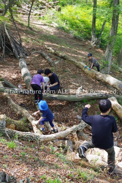 自分たちで見つけた脚立をはしごにしたり、木のすべり台やシーソーもあります。